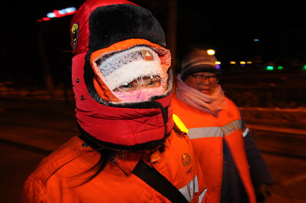 1月23日,在黑龍江省牡丹江市西安區,環衛工們完成晨掃,帽子上結著霜花。新華社發(張春祥 攝)
