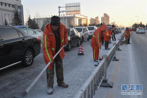 內蒙古自治區呼倫貝爾市冬季漫長。12月22日,環衛工人在道路上清雪除冰。新華社記者 劉磊 攝