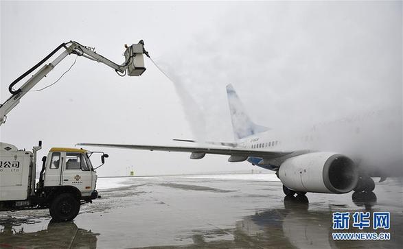 1月4日,銀川河東國際機場機務人員對飛機進行除冰作業。新華社記者 王鵬 攝