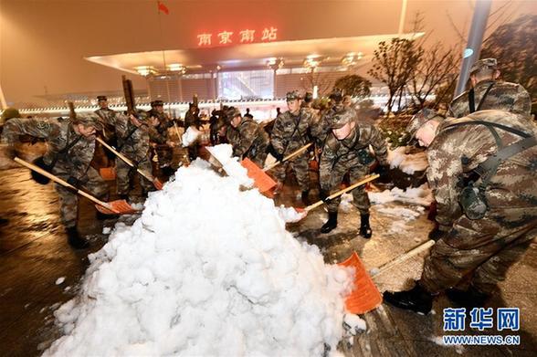 1月5日,東部戰區陸軍“臨汾旅”官兵在南京南站北廣場掃雪除冰。新華社發(于同化 攝)