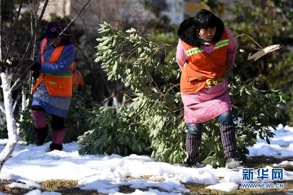 1月11日,持續大雪將合肥很多城市綠化樹木壓折,幾名綠化工人在清理折斷的樹枝。新華社記者劉軍喜攝