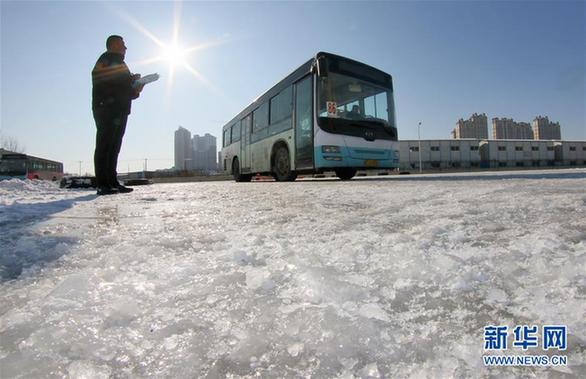 1月12日,在山東煙臺孫家灘公交場站,工作人員考核駕駛員冰雪路面駕駛技能。新華社發(唐克 攝)