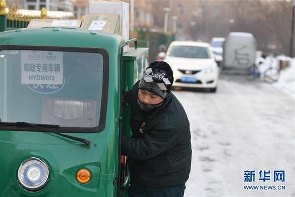 1月23日,“冰城”哈爾濱市最低氣溫為零下35攝氏度,投遞員于明寶冒著嚴寒,像往常一樣為客戶投遞郵件。新華社記者 王松攝