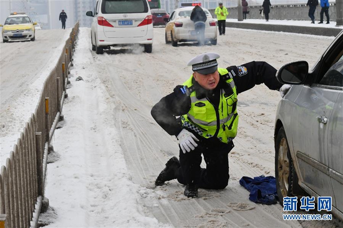 1月27日,在湖北省武漢市江漢一橋橋面,民警將衣服鋪墊在雪地上協(xié)助推車。新華社發(fā)(金思柳 攝)