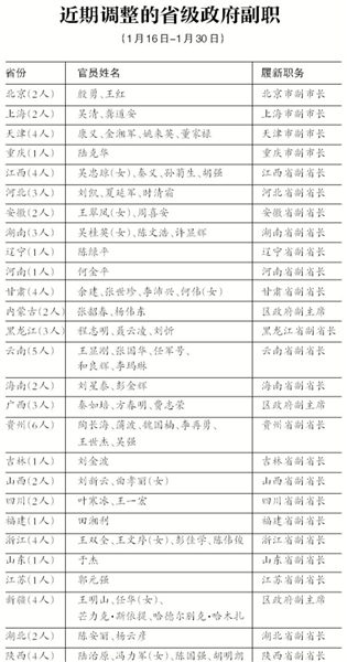 記者注意到,從1月16日開始的省級政府副職調整共涉及27省份,1月16日至24日這一批省級政府副職調整,共涉及23個省份,4大直轄市均有調整。26日至30日,經過省級人大會議選舉,37位“本土派”副省長當選。