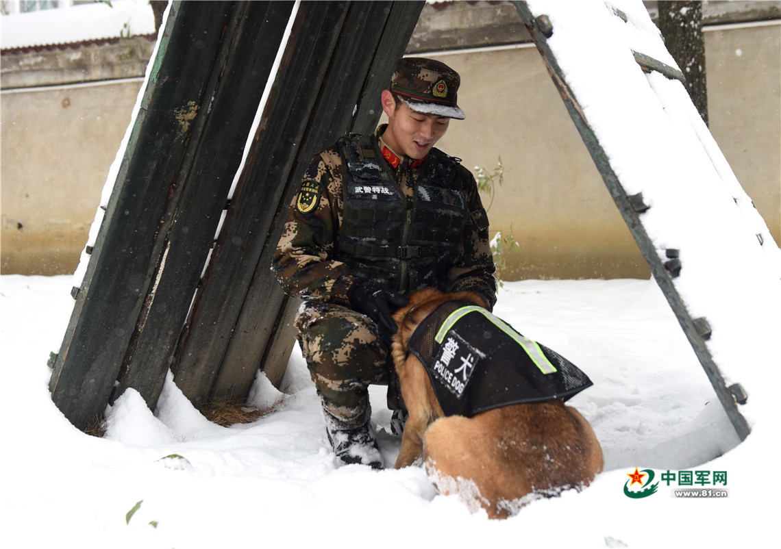 1月27日,訓練間隙,警犬“魯克”一頭扎進警犬班班長王營廣的懷里撒嬌。
