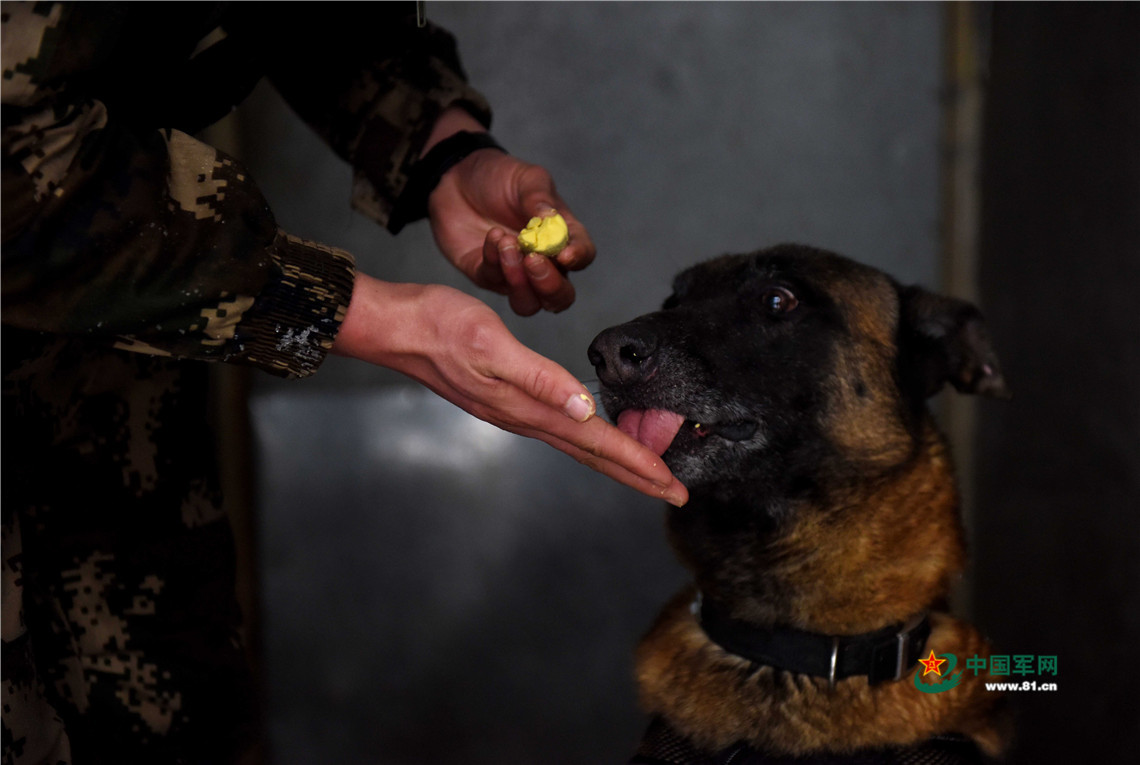 1月27日,武警安徽總隊機動支隊警犬班班長王營廣在給警犬“魯克”喂食煮雞蛋。
