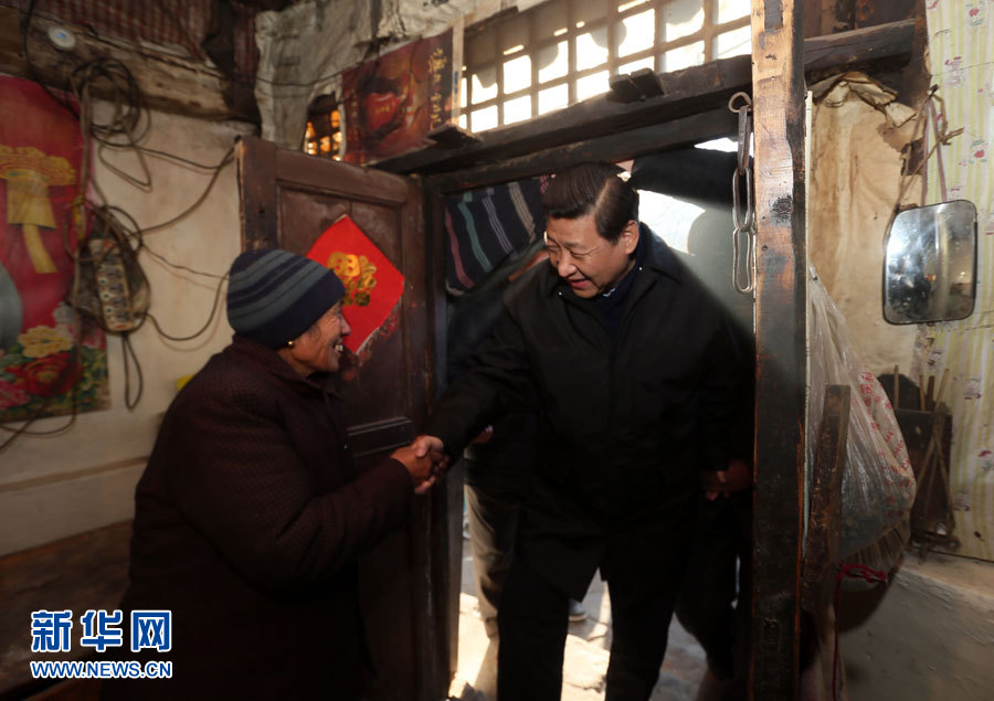 在河北阜平龍泉關鎮駱駝灣村困難戶唐榮斌家,習近平拿起桌上的藥瓶仔細查看,囑咐老人多多保重身體。