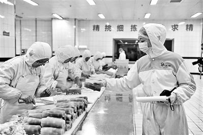 昨天,北京青年報(bào)記者走進(jìn)北京京鐵列車服務(wù)有限公司餐食生產(chǎn)基地探訪。從早上8點(diǎn)開始,各種種類的盒飯就開始進(jìn)行生產(chǎn)制作了。進(jìn)貨檢驗(yàn)、毛菜處理、精加工、炒制、快速降溫、稱重包裝、金屬異物檢測(cè)、抽檢留樣……一盒高鐵盒飯的生產(chǎn)出爐要經(jīng)過大大小小十幾道工序,食品安全總被放在第一位。