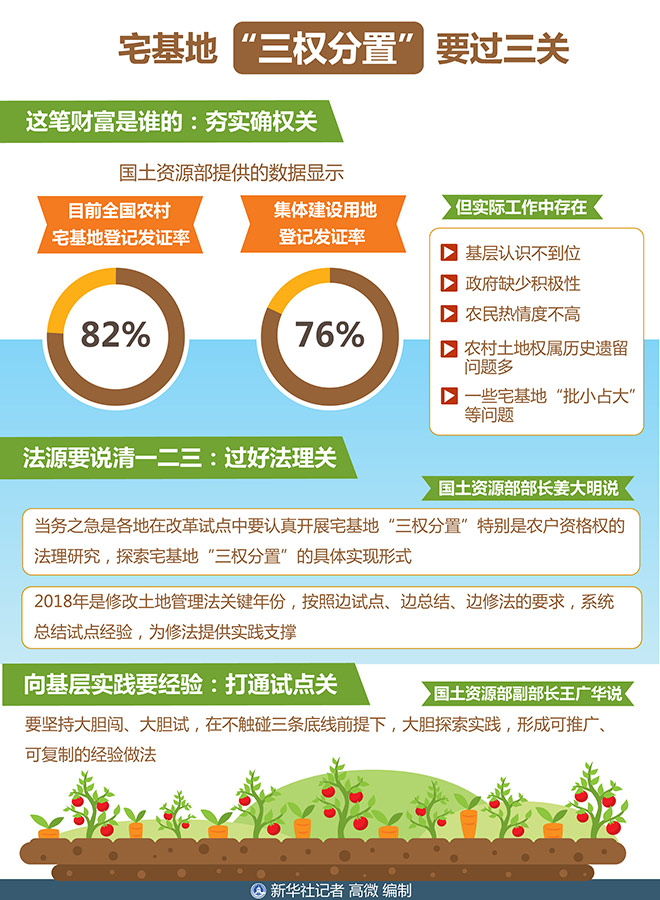 “這是一項重大的理論和實踐創新,為深化改革指明了方向。”國土資源部部長姜大明說,當務之急是各地在改革試點中要認真開展宅基地“三權分置”特別是農戶資格權的法理研究,探索宅基地“三權分置”的具體實現形式。