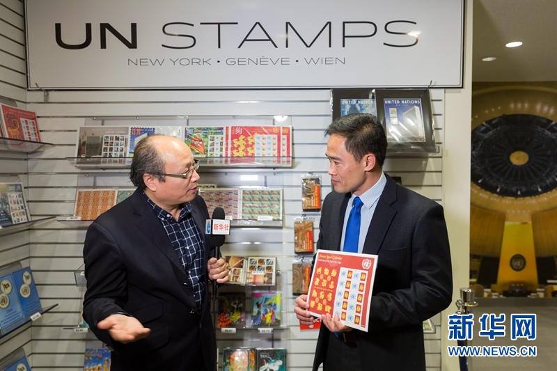 2月7日,在位于紐約的聯合國總部,聯合國郵政管理局局長謝德勝(右)接受記者采訪。新華網記者李木子 攝