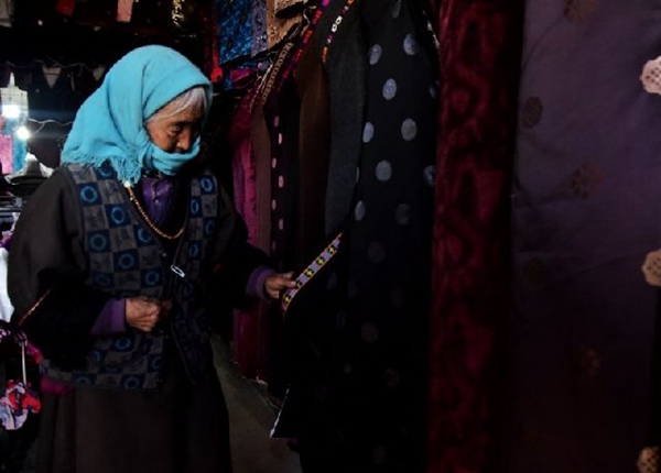 一位老人在旦增加的藏服店挑選衣服。新華社發(田文杰 攝)