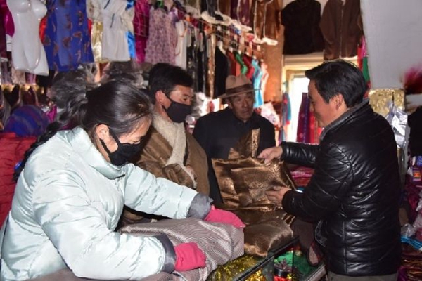 今年的藏歷新年和春節“喜相逢”。月初,同德縣城老城區車水馬龍,處處洋溢著過年的喜慶氣氛,擁擠的街道兩旁擺滿了各式各樣的商品,各族群眾忙著購置年貨。老旦正忙著打理自己的藏服店,十幾種藏服款式,吸引著一撥撥的客人惠顧,讓他幾乎沒有空閑和記者聊天。他說,這段時間每天的毛收入都在萬八千的?!翱腿硕嗟臅r候連午飯都顧不上吃!”