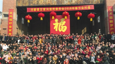 近四米見(jiàn)方的大紅“福”字懸掛在舞臺(tái)中央,上面是寫(xiě)有“河順鎮(zhèn)王家溝居民委員會(huì)2018年春節(jié)全村福”的大紅條幅。這樣喜慶的背景下面,是700多人笑逐顏開(kāi)的臉。2月16日,大年初一,河南林州河順鎮(zhèn)王家溝村村民們拍了全村有史以來(lái)的第一張全村福。