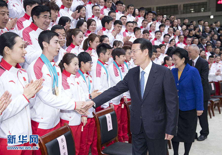 2月27日,國(guó)務(wù)院副總理、第24屆冬季奧林匹克運(yùn)動(dòng)會(huì)工作領(lǐng)導(dǎo)小組組長(zhǎng)張高麗在北京會(huì)見載譽(yù)歸來(lái)的平昌冬奧會(huì)中國(guó)體育代表團(tuán)。新華社記者王曄攝