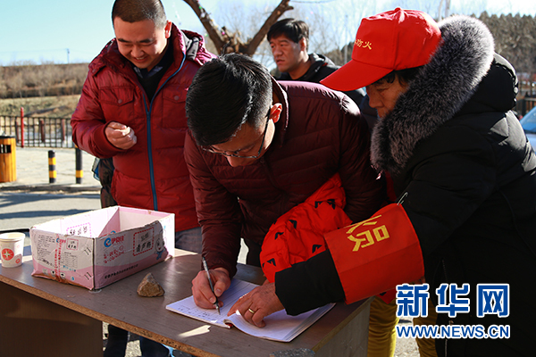 上山游客做登記并將打火機暫存給護林員。新華網 周靖杰 攝
