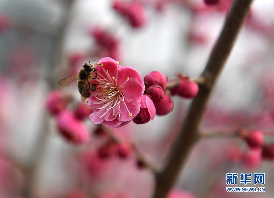 3月14日,在河北省石家莊市民心河畔,蜜蜂在花間采蜜。 新華社發(fā)(張震 攝)
