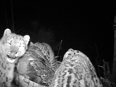 當(dāng)人們趕到后,雪豹已經(jīng)不在現(xiàn)場(chǎng)。于是,工作人員在牦牛尸體附近的樹上布下了兩臺(tái)紅外相機(jī),捕捉到了前面所述的畫面。“我們?cè)诎惭b機(jī)器時(shí),雪豹就在二十米開外的一塊巨石背后,我看到了它放光的眼睛?!?/p>