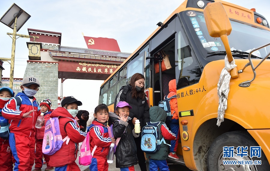 3月27日,克松村的孩子們登上校車出發去幼兒園。 新華社記者覺果攝