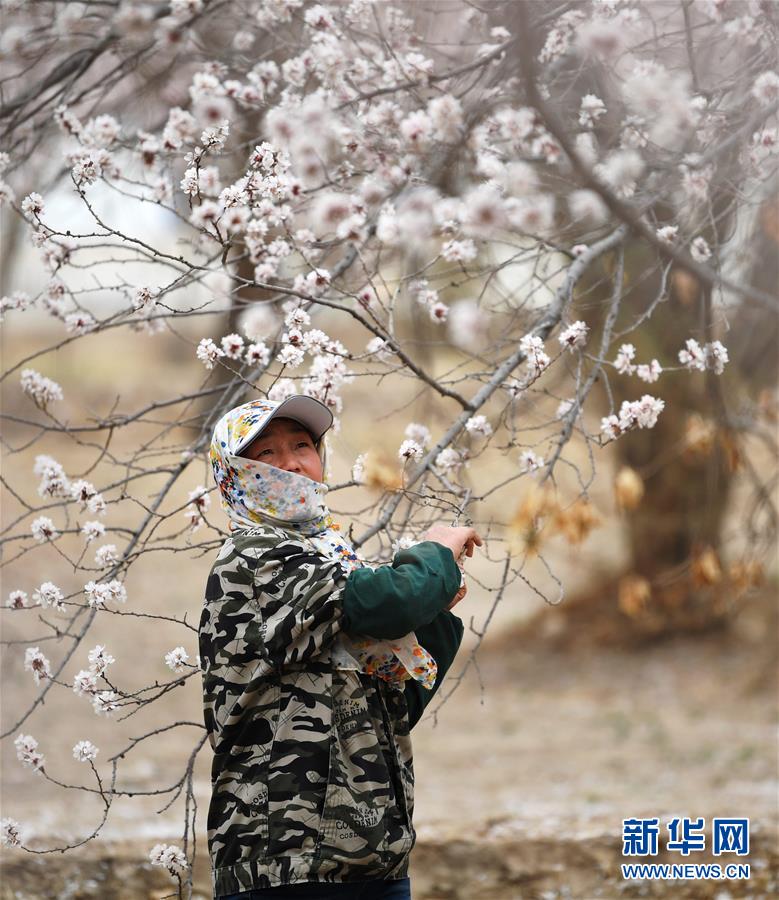 3月28日,農民在敦煌鳴沙山下的李廣杏園內勞作。近日,甘肅省敦煌市鳴沙山下8000多畝李廣杏花競相開放,吸引了眾多游客和市民踏青賞花。 新華社記者陳斌攝