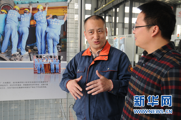 胡明華(左)與團隊成員一起向記者回憶2008年他們援助東汽災后重建工作的情形。新華網 聶晨靜 攝
