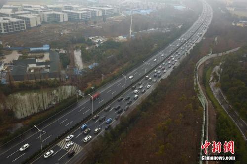 資料圖:2月21日,大批車輛由北向南緩慢行駛在南京二橋高速公路上,綿延數公里。 中新社記者 泱波 攝