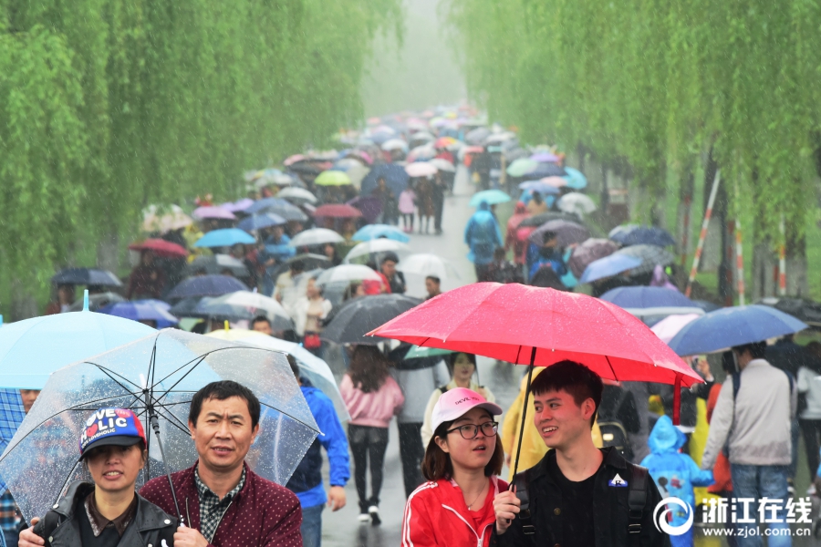 4月5日,清明小長假首日,杭州細雨綿綿,西湖景區游客絡繹不絕。杭城雖降雨降溫,但西湖景區前來賞花踏青的游客如潮,斷橋似人橋。(浙江在線拍友 里爾 柱子 攝)