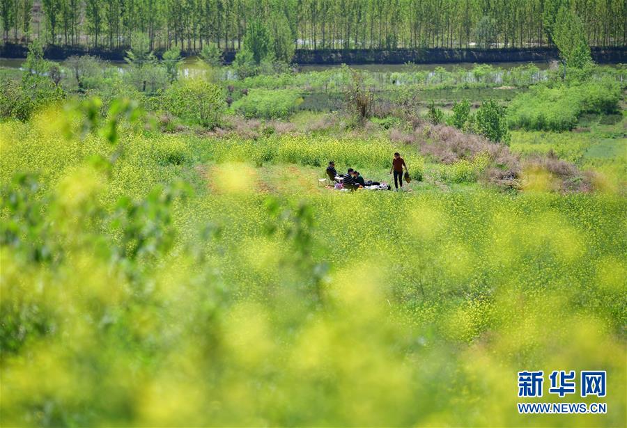 4月7日,游人在位于長安區的梯田油菜花海內游玩休息。清明小長假期間,陜西省西安市長安區內的梯田油菜花海黃綠相間、層層疊疊,如畫的風景吸引游客前來觀賞。 新華社記者 邵瑞 攝