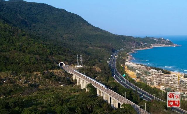 藍(lán)天碧海,文昌航天發(fā)射場(chǎng)箭指太空,三亞國(guó)際郵輪港碼頭萬(wàn)噸郵輪矗立,環(huán)島高鐵火車飛馳……