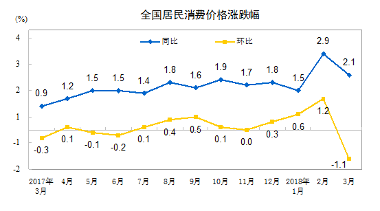 2018年3月份,全國居民消費價格同比上漲2.1%。其中,城市上漲2.1%,農村上漲1.9%;食品價格上漲2.1%,非食品價格上漲2.1%;消費品價格上漲1.6%,服務價格上漲2.8%。一季度,全國居民消費價格總水平比去年同期上漲2.1%。