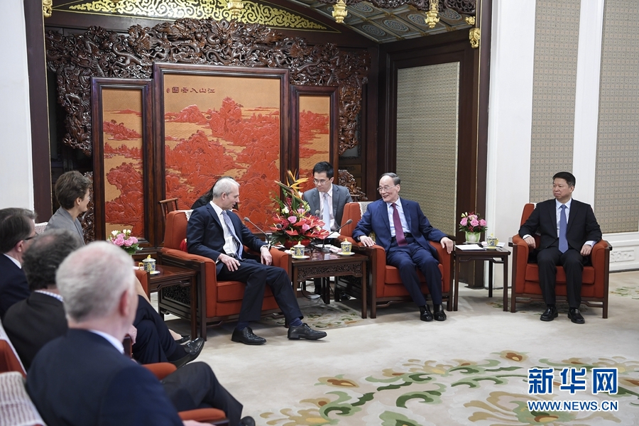 4月11日,國家副主席王岐山在北京中南海會見英國內(nèi)閣辦公廳大臣利丁頓率領(lǐng)的第十屆中英政黨對話英方代表團。 新華社記者 張領(lǐng) 攝