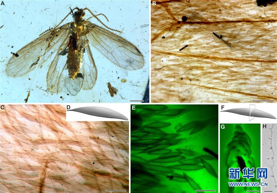 緬甸琥珀中飄翅目昆蟲及其鱗片結(jié)構(gòu)的圖片。新華社發(fā)(中國科學院南京地質(zhì)古生物研究所提供)