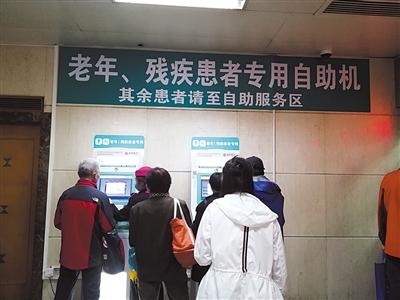 昨日,同仁醫院一樓門診大廳,老年人正在使用專用自助機。新京報記者 戴軒 攝 圖片來源:新京報