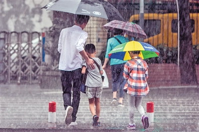 昨日(14日),廣州海珠區南華中路,市民正在冒著大雨過馬路。 廣州日報全媒體記者莫偉濃 實習生林澤君 攝