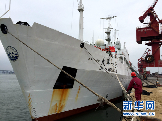??? 這是4月15日拍攝的??吭趶B門現代碼頭的“大洋一號”科考船。當日,搭載“潛龍三號”無人無纜潛水器和70名科考隊員的“大洋一號”科考船從廈門起航,奔赴南海執行“大洋一號”綜合海試B航段科考任務。這也是目前我國最先進的自主無人潛水器“潛龍三號”首次出海。新華社記者 劉詩平 攝