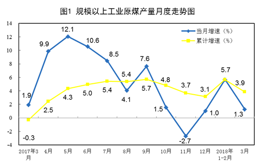一季度,原煤產(chǎn)量8.0億噸,同比增長3.9%。3月份,原煤產(chǎn)量同比增長1.3%,比1-2月份回落4.4個百分點。