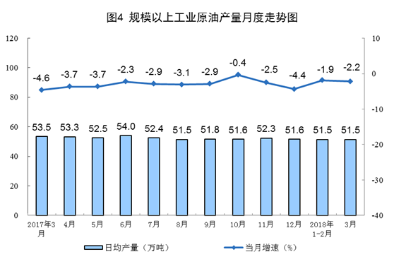 一季度,原油產(chǎn)量4633萬噸,同比下降2.0%,降幅比去年同期收窄4.8個百分點。3月份,原油生產(chǎn)同比下降2.2%,日均產(chǎn)量51.5萬噸。