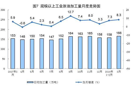 受去年下半年國內(nèi)新增煉化產(chǎn)能陸續(xù)投產(chǎn)和2018年首批原油進(jìn)口配額大幅增加影響,一季度原油加工量明顯增長,同比增長7.5%,增速比去年同期加快3.0個百分點。3月份,原油加工量同比增長8.3%,日均加工166.2萬噸,為歷史最高水平。其中,汽油、煤油和柴油產(chǎn)量分別增長5.7%、14.6%和1.3%。