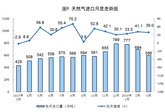 天然氣進(jìn)口高速增長。一季度,進(jìn)口天然氣2062萬噸,同比增長37.3%。3月份,進(jìn)口天然氣596萬噸,同比增長39.0%,增速比1-2月份放緩2.1個百分點。