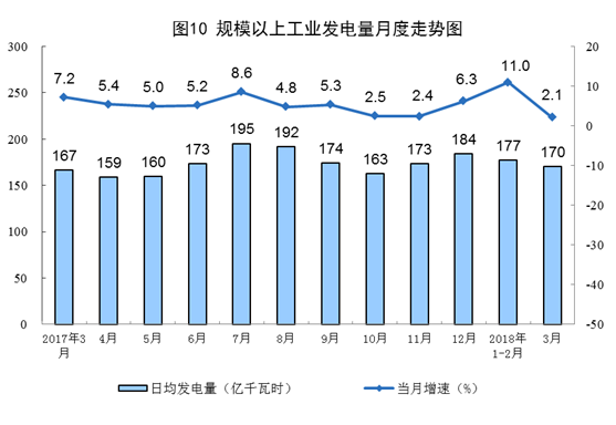 一季度發(fā)電1.6萬億千瓦時,發(fā)電量快速增長,同比增長8.0%,增速比去年同期加快1.3個百分點。3月份,全國平均氣溫較常年同期偏高2.9℃,而去年同期氣溫接近常年,且本月較去年同期少1個工作日,受此影響,發(fā)電量增速有所回落,同比增長2.1%。
