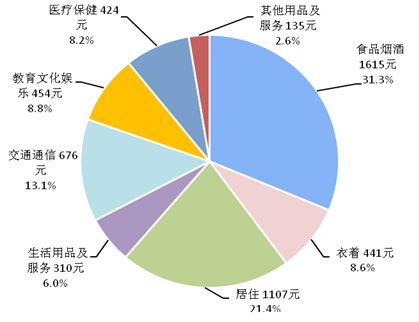 一季度,全國居民人均食品煙酒消費支出1615元,增長5.2%,占人均消費支出的比重為31.3%;人均衣著消費支出441元,增長9.4%,占人均消費支出的比重為8.6%;人均居住消費支出1107元,增長13.1%,占人均消費支出的比重為21.4%;人均生活用品及服務消費支出310元,增長11.9%,占人均消費支出的比重為6.0%;人均交通通信消費支出676元,增長4.9%,占人均消費支出的比重為13.1%;人均教育文化娛樂消費支出454元,下降5.4%,占人均消費支出的比重為8.8%;人均醫(yī)療保健消費支出424元,增長20.7%,占人均消費支出的比重為8.2%;人均其他用品及服務消費支出135元,增長6.3%,占人均消費支出的比重為2.6%。