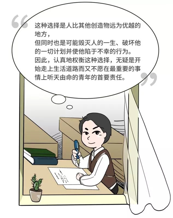 “這種選擇是人比其他創(chuàng)造物遠(yuǎn)為優(yōu)越的地方,但同時也是可能毀滅人的一生、破壞他的一切計劃并使他陷于不幸的行為。因此,認(rèn)真地權(quán)衡這種選擇,無疑是開始走上生活道路而又不愿在最重要的事情上聽天由命的青年的首要責(zé)任?!?/p>