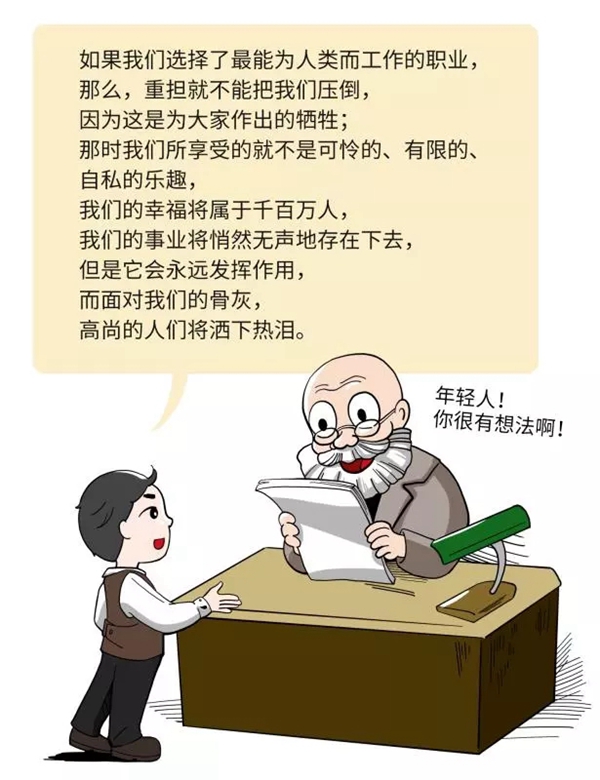 “如果我們選擇了最能為人類而工作的職業(yè),那么,重?fù)?dān)就不能把我們壓倒,因為這是為大家作出的犧牲;那時我們所享受的就不是可憐的、有限的、自私的樂趣,我們的幸福將屬于千百萬人,我們的事業(yè)將悄然無聲地存在下去,但是它會永遠(yuǎn)發(fā)揮作用,而面對我們的骨灰,高尚的人們將灑下熱淚。”