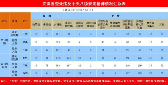 今年1至3月,安徽省共查處違反中央八項規定精神問題544個,處理749人,給予黨紀政務處分553人。