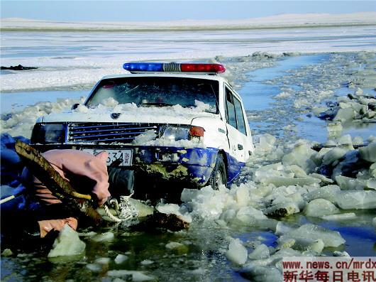 ▲2006年11月13日,達賚湖公安分局執勤車輛在冰面上遇險?!∈茉L者供圖