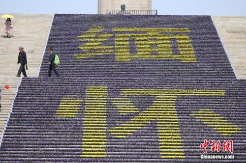 資料圖:3月26日,南京雨花臺烈士陵園內的烈士紀念碑前布置了由數萬盆鮮花組成的“緬懷”花壇,以此表達對革命英烈的紀念之情。 中新社記者 泱波 攝