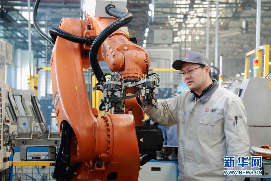 中國中車戚墅堰機車車輛工藝研究所有限公司首席技師劉云清在改進中車戚墅堰所首條機器人渦輪殼生產線的機器人夾具(資料照片)。新華社發(fā)