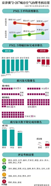 評估結果顯示,2017年10月至2018年3月,“2+26”城市PM2.5平均濃度最低的3個城市依次是北京、廊坊和天津;濃度最高的3個城市依次是邯鄲、邢臺和安陽。