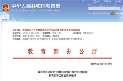 4月20日,教育部官網(wǎng)發(fā)布《關于做好預防中小學生沉迷網(wǎng)絡教育引導工作的緊急通知》,其中提及,“隨著互聯(lián)網(wǎng)和手機終端發(fā)展,成癮性網(wǎng)絡游戲、邪惡動漫、不良小說、互聯(lián)網(wǎng)賭博等不斷出現(xiàn),造成一些中小學生沉迷游戲、行為失范、價值觀混亂等問題,嚴重影響了中小學生的學習進步和身心健康,甚至出現(xiàn)人身傷亡、違法犯罪等惡性事件。”
