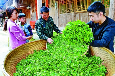 在福建省武夷山國家級自然保護區內的桐木村,回鄉創業的大學畢業生徐建(右)攤晾鮮茶葉。新華社發